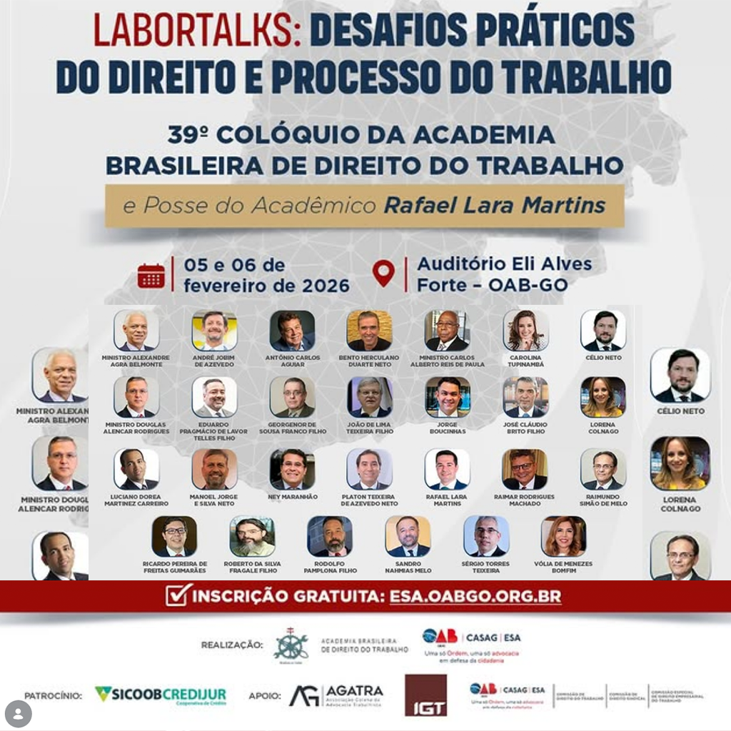 Nos dias 05 e 06 de fevereiro, acontece o 39º Colóquio da Academia Brasileira de Direito do Trabalho, juntamente com a posse do acadêmico Rafael Lara Martins. 📚