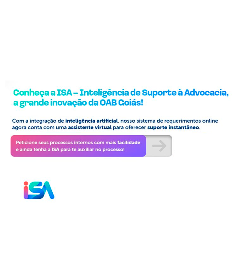 Conhece a ISA? A nova versão de sua plataforma de serviços para requerimentos online. A grande novidade é a funcionalidade exclusiva para peticionamentos internos, impulsionada por inteligência artificial. Batizada de ISA – Inteligência de Suporte à Advocacia, essa nova ferramenta auxilia a advocacia no peticionamento a partir da solicitação por escrito, tornando o processo mais prático e eficiente.